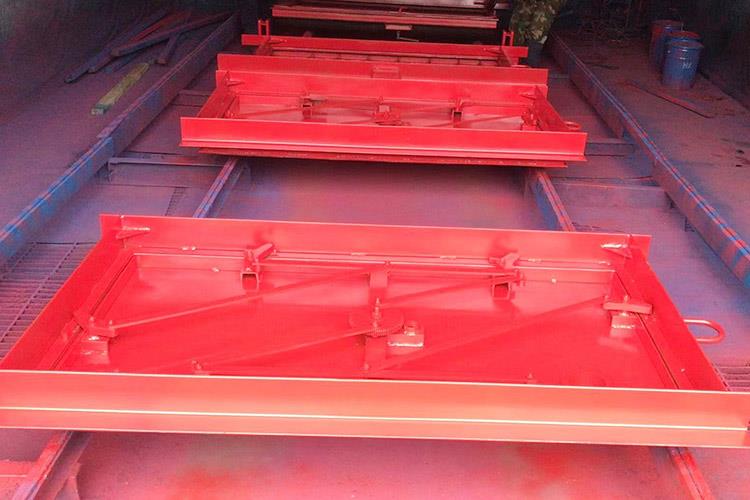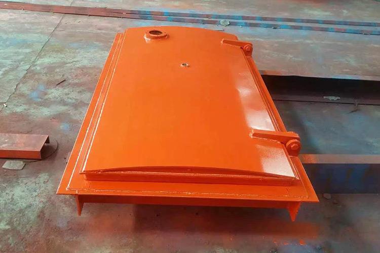 避難硐室密閉門使用對(duì)稱的方式進(jìn)行安裝,它的每一個(gè)安裝件都是使用鋼材料來焊接成的。避難硐室密閉門的門扇是由井字結(jié)構(gòu)來進(jìn)行焊接的,反風(fēng)的主要裝置是采用鋼管來插拴的,安裝的時(shí)候在合頁處涂上潤滑油,保證使用的靈活性。斜風(fēng)井防爆門關(guān)門時(shí),各部件反向擺動(dòng),到關(guān)閉狀態(tài)時(shí)成矩形狀態(tài)。